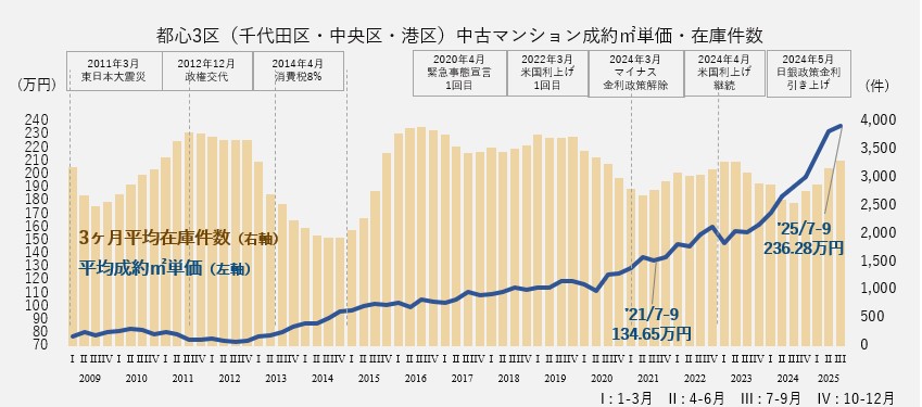 2021年7-9月の都心3区平均成約㎡単価は134.65万円、2025年同時期は236.28万円と約75%上昇し、高水準を維持しています。価格は過去数年間、上昇と一時的な調整を繰り返しつつ推移しており、直近でも高水準を保っています。在庫数は増減を繰り返しながら全体として上昇傾向が続き、直近期は再び高水準に達しています。